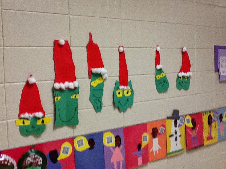 It was a day of reading. Our first guest reader read Santa Cows , and The Grinch That Stole Christmas. Afterwards, we did a Grinchy craft. We used a green, red and a small piece of yellow construction paper, glue, and a few cotton balls. First we folded the green construction paper in half and tore the shape of a half heart on the unfolded side. Then we tore a triangle out of the red piece. Next, we turned the green heart upside down and put the triangle on top to make it look like a hat and glued the two pieces together. We then lined the hat with cotton and gave it a cotton ball tip. We tore the yellow to make eyes and glued them under the hat. We added pupils and eyelashes and a smile. We had some of the best looking Grinches in the history of Grinchness.