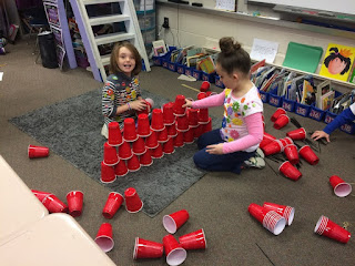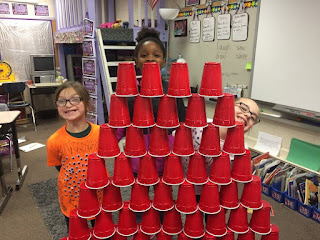 Next we had several centers that they played based on one hundred. They had to build a cup tower out of one hundred cups. Each group was trying to build the tallest tower. As you will see the final pictures show the group that achieved their goal.
