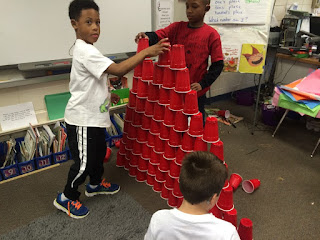 Next we had several centers that they played based on one hundred. They had to build a cup tower out of one hundred cups. Each group was trying to build the tallest tower. As you will see the final pictures show the group that achieved their goal.